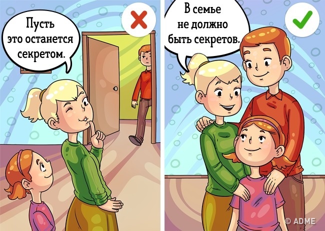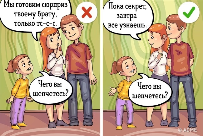 Іноді мама або тато, заручившись підтримкою дитини, довіряють йому якусь таємницю, яку той повинен зберігати і нікому не відкривати. Не змушуйте дитину відчувати зайві переживання з приводу того, що він «обманює» кого-то. Краще довірте свою таємницю подрузі або другу.
