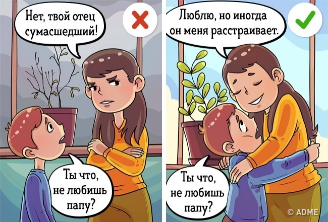 У пориві емоцій ми можемо при дитині зопалу наговорити про свого улюбленого людини зовсім неприємні речі. Дитина ні в якому разі не повинен чути ваших гнівних емоцій на адресу свого другого батька, які цілком можуть підірвати його авторитет.