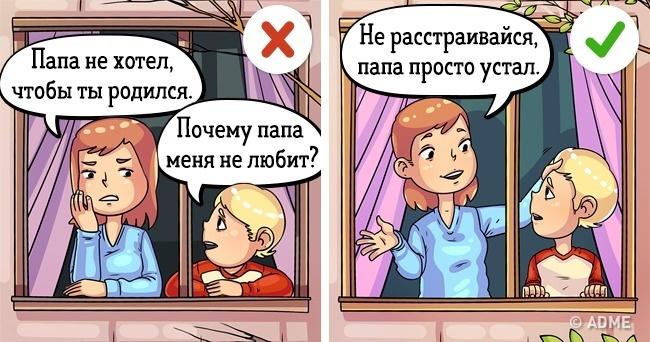 Іноді мамі, якщо вона в поганих стосунках з татом (і навіть якщо в хороших), дуже хочеться, щоб восторжествувала справедливість». Тому вона розповідає дитині про те, що насправді батько був проти появи малюка на світ. Не варто про це говорити дитині: щасливішими від цієї новини він точно не стане.