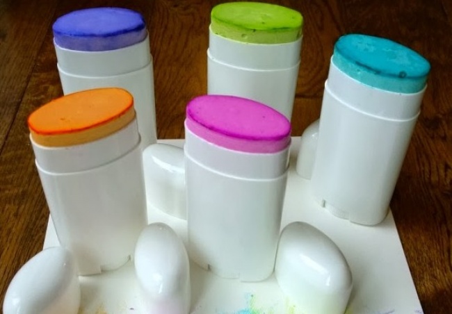 Кольорові крейди забруднюють не тільки руки, але і одяг, щоб цього не сталося, зробіть кольорову крейду самостійно і помістіть його в ємність від старого дезодоранту-стика.