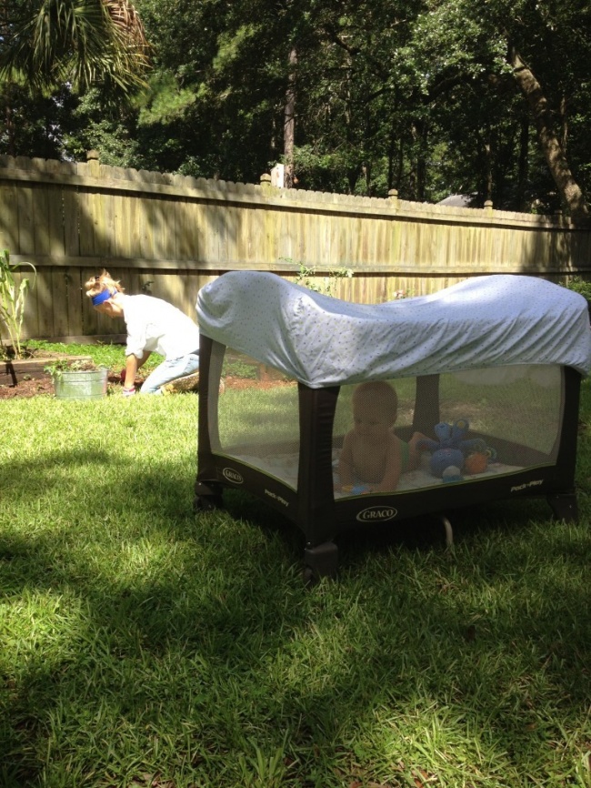 Щоб малюк не перегрівся на сонечку і не свербів від укусів комарів, накрийте манеж простирадлом.
