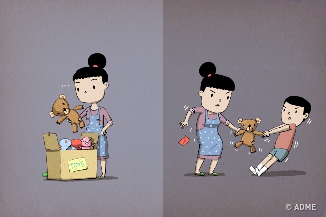 Батьки помилково вважають, що краще розбираються в тім, які речі потрібні їх дитині, а які — ні. Тому вони часто віддають іграшки та одяг своєї дитини іншим, не спитавши дозволу. З-за цього маляті починає здаватися, що його речі йому не належать, і він намагається завзято відстоювати право володіння ними.