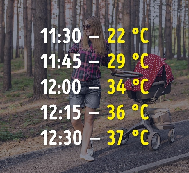 Дослідження показало, що якщо коляску нічим не накривати, то в ній буде зберігатися стабільна температура в районі 22 °C, в закритій ж колясці температура зростає до рекордних 34 °C. Тому ні в якому разі не можна накривати коляску.