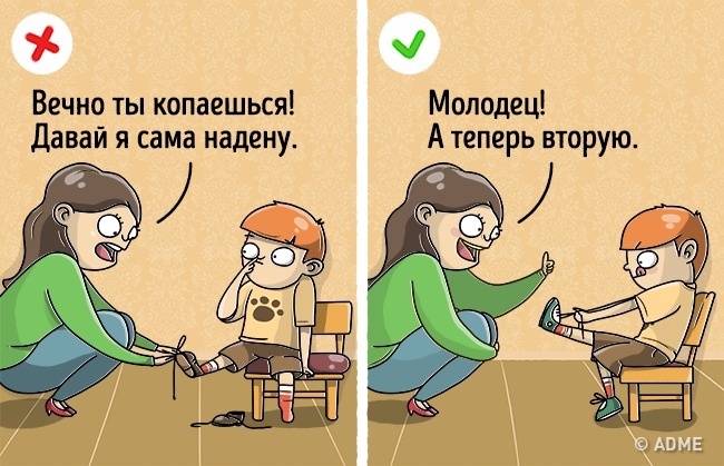 Кожному страшно зробити помилку, а ще страшніше, коли тебе квапить дорослий або лає за неправильно застебнуту кофту. Не дивно, якщо після такого дитина расхочет коли-небудь пробувати щось робити сам.