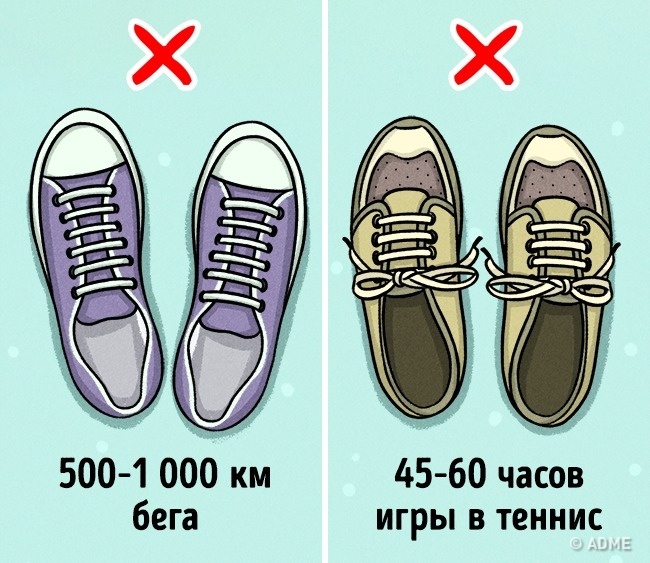 Взуття підлягає заміні, якщо ви пробігли в ній від 500 до 1 000 км або 45-60 годин грали в баскетбол, теніс або займалися танцювальною аеробікою. Ваші кросівки проживуть довше, якщо ви будете чергувати різні пари. Дослідження показують, що поперемінно бігати в двох пар взуття вийде так само довго, як у трьох, використаних по черзі.