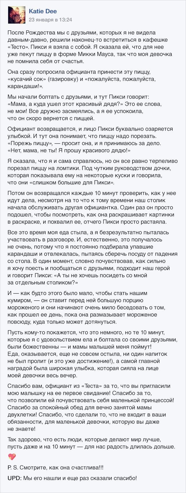 Одного разу Кеті вирушила пообідати в кафе з друзями і взяла з собою доньку. І була вражена добротою офіціанта, який подружився з її малою і запросив ту побалакати за окремим столиком, щоб мама змогла хоча б трохи спокійно поспілкуватися з друзями.
