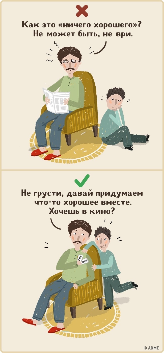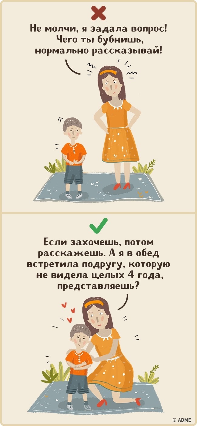 Слухаючи розповідь вашої дитини, не перебивайте його і не поспішайте виносити судження, коментуйте тільки тоді, коли вас про це попросять. Не ігноруйте тілесний контакт: обніміте вашого малюка або візьміть за руку. Якщо ви зараз в поганому настрої або у вас немає часу — чесно скажіть дитині про це і домовтеся, коли ви зможете поспілкуватися пізніше.