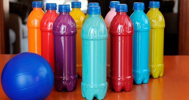 З порожніх пластикових пляшок вийдуть відмінні кеглі для боулінгу, особливо якщо наповнити їх підфарбованою водою.