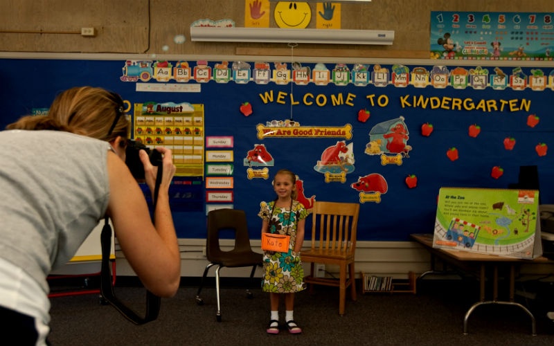Хвилюючий момент: 5-річна Кейт вперше прийшла в дитячий сад. Її фотографує мама.