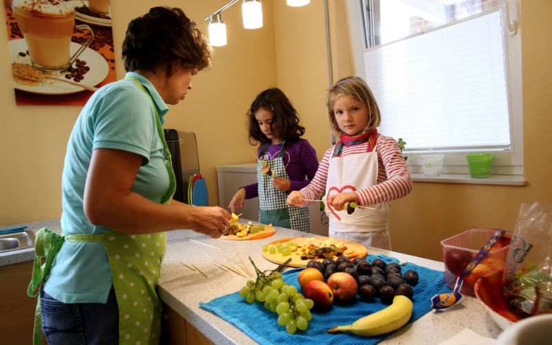 Це дитячий садок в Альтенберге. Діти допомагають вихователю приготувати ланч, який потім буде поданий для всієї групи.