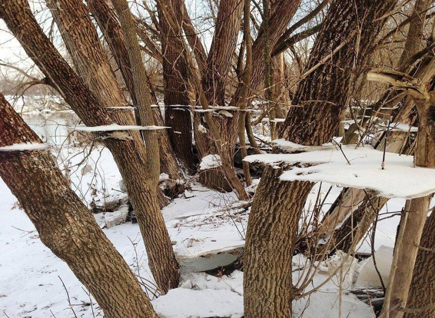Замерзлий сніг, залишився на деревах після повені.