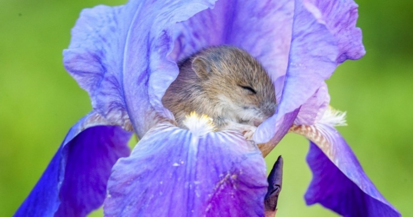 Мыщонок полівки, заснув у ірисі.