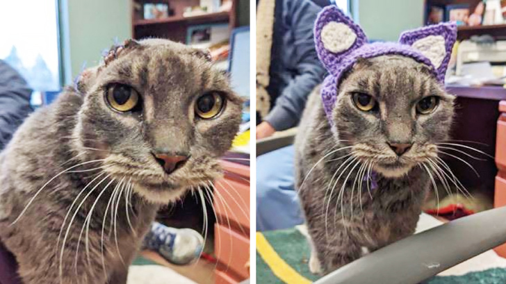 Після того як ця кішка втратила вуха з-за інфекції, співробітник Товариства захисту тварин Дейне зробив їй в'язану шапочку у формі вух