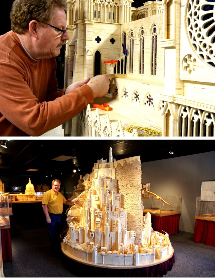 19. Чоловік більше 40 років збирає з сірників скульптури, на кожну з яких іде по 2-3 роки. На фото собор Паризької Богоматері і фортеця Мінас Тирит