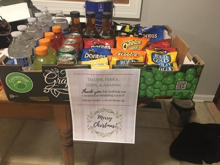 12. Сім'я залишила перед будинком коробку з частуванням для кур'єрів, які доставляють замовлені подарунки до Різдва