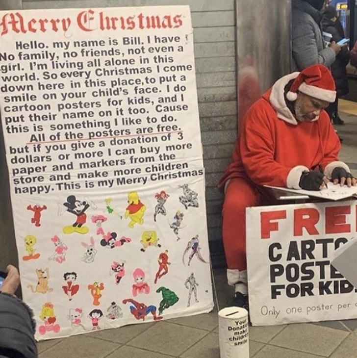 «Привіт, мене звуть Білл. У мене немає сім'ї, друзів, навіть дівчата. Я один в цьому світі. Щороку за традицією я приходжу сюди, щоб викликати посмішки на дитячих обличчях. Я малюю героїв мультиків і пишу під ними імена дітей. Тому що мені подобається це робити. Всі малюнки безкоштовні, але якщо ви пожертвуєте $ 3 або більше, я зможу купити більше паперу і маркерів і зробити щасливими більше дітей. З Різдвом!»