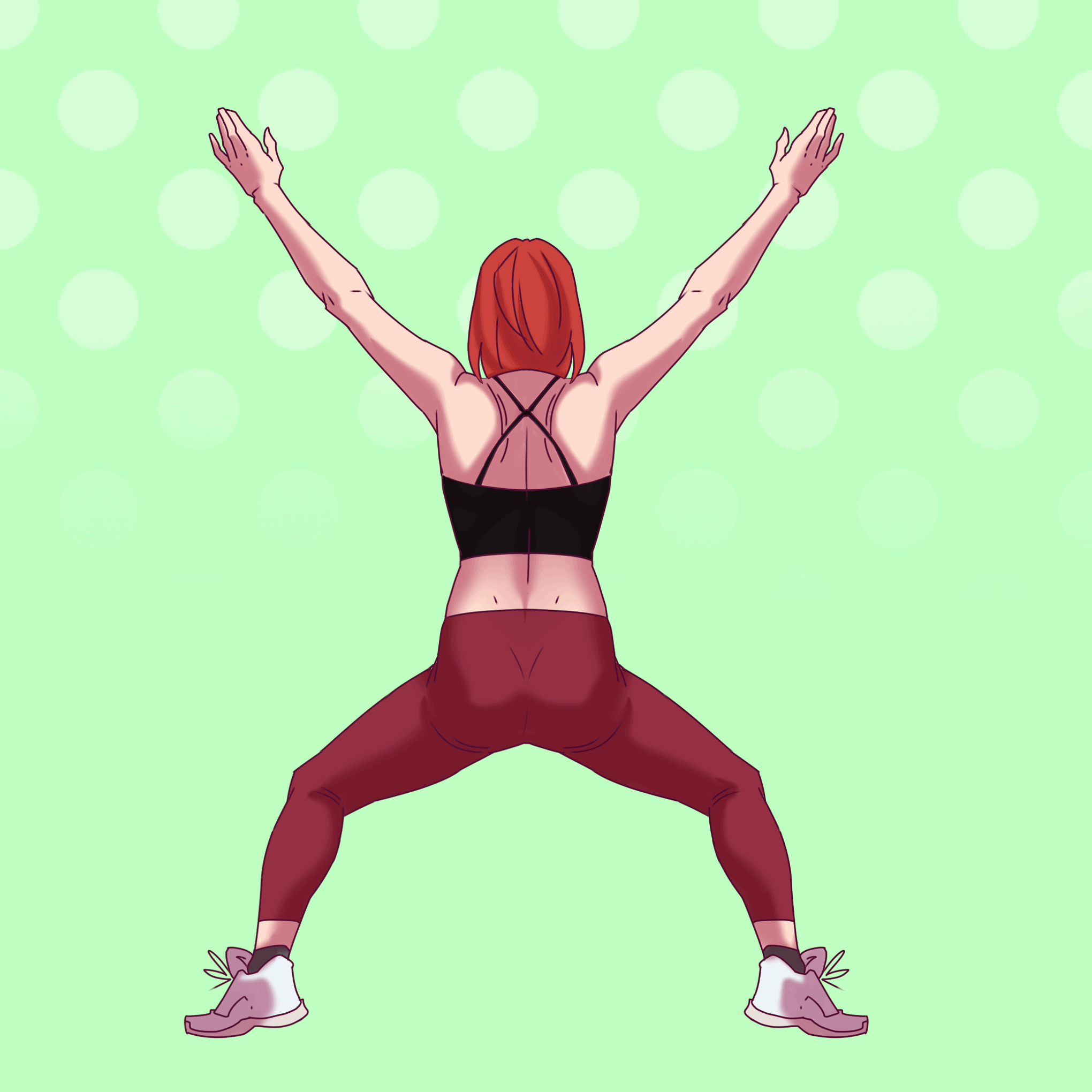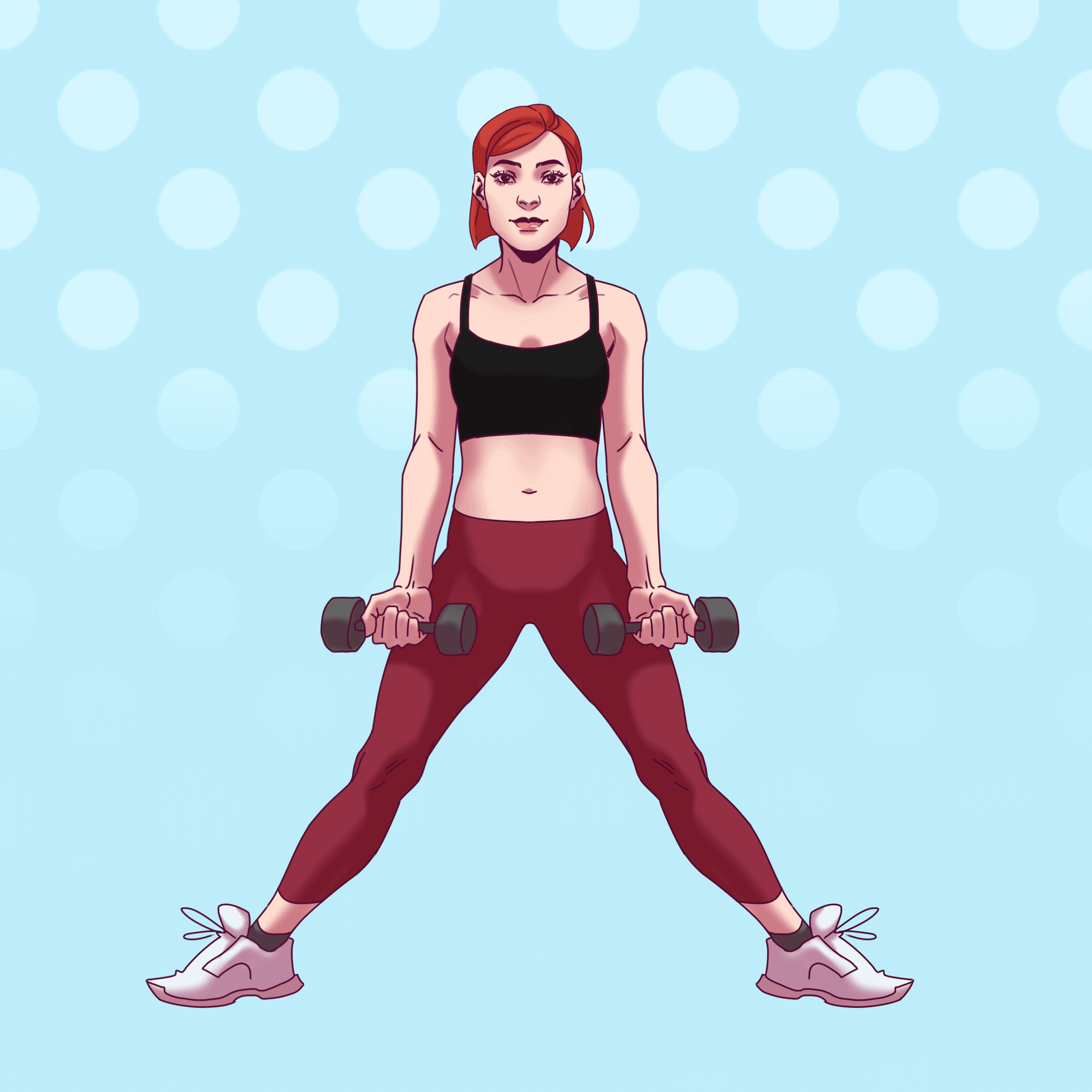 Вихідне положення: стоячи прямо, ноги широко розставити — в 2 рази ширше плечей (шкарпетки дивляться злегка назовні), в руках гантелі для обважнення (їх вага підберіть індивідуально), спина пряма.