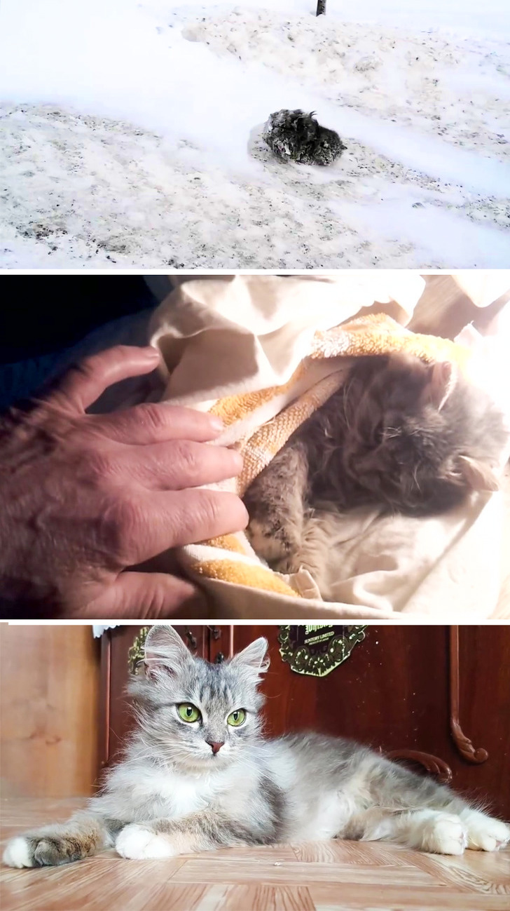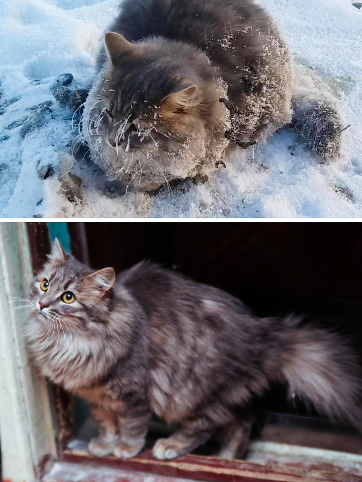 1. Бездомний кіт примерз до льоду на землі. Його потроху поливали теплою водою, поки не вивільнили всі лапи. Зараз Семен обзавівся мискою в новому будинку і іноді дозволяє собі вередувати, якщо в чашці не той корм