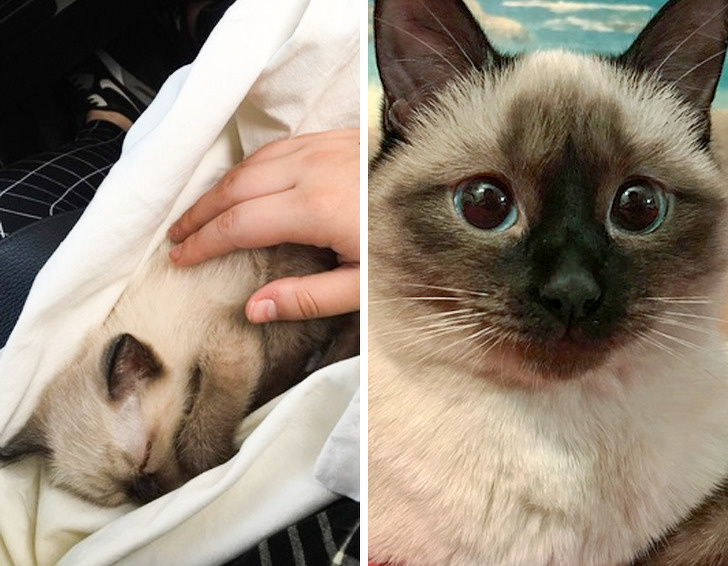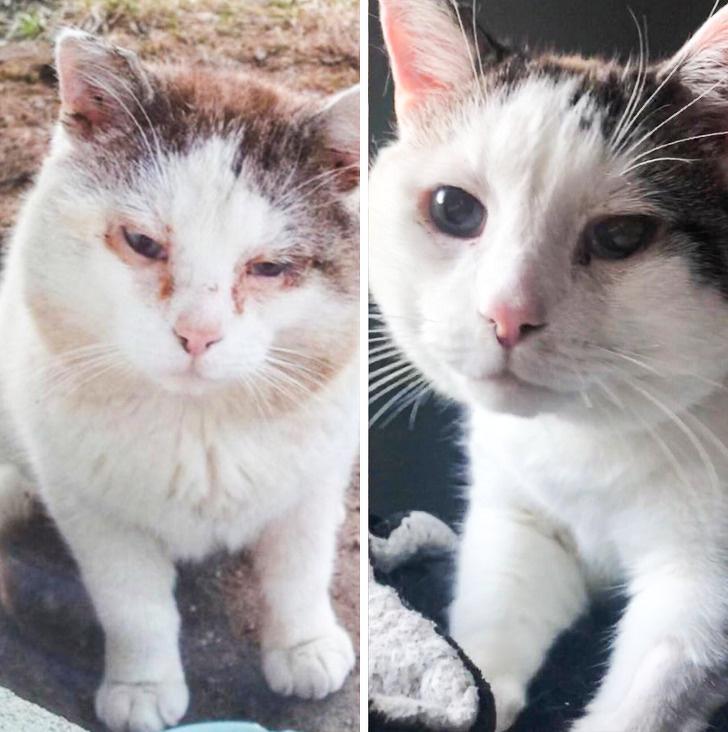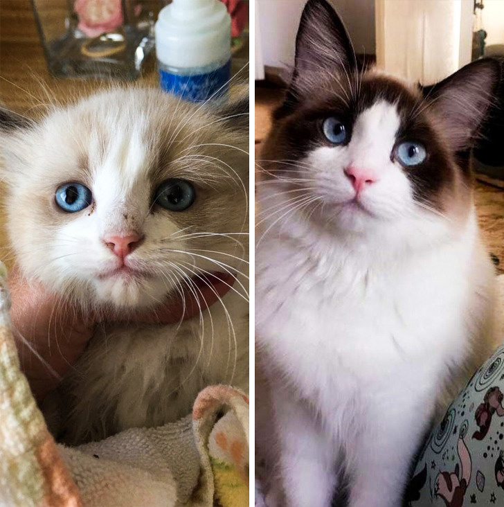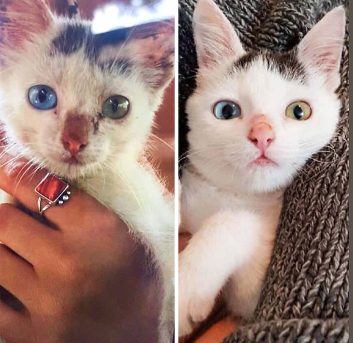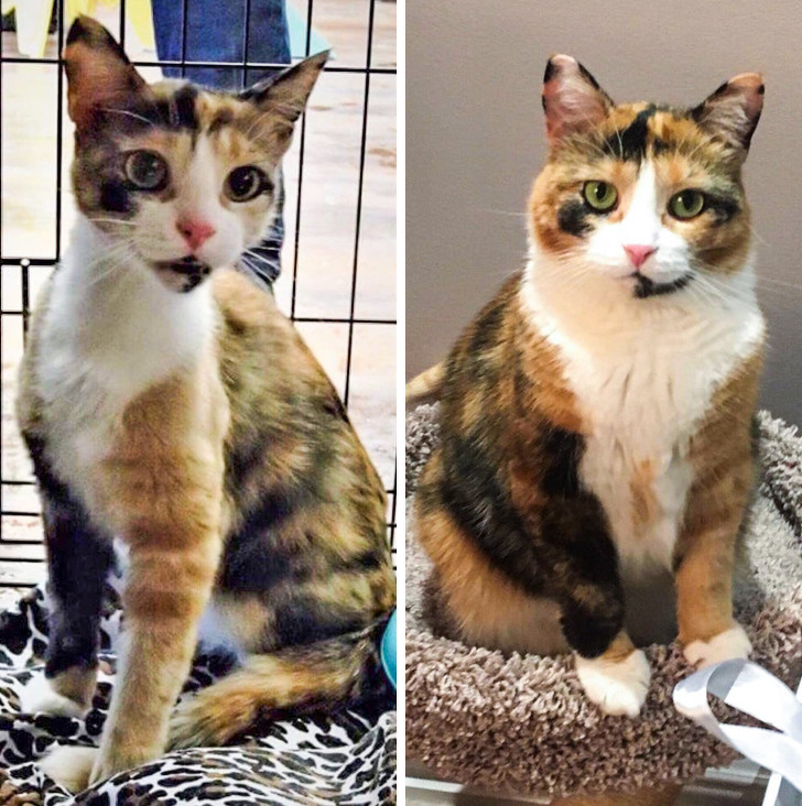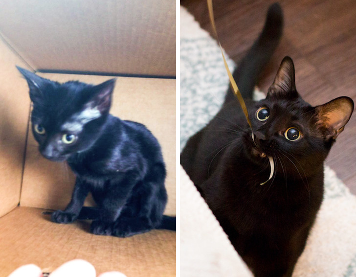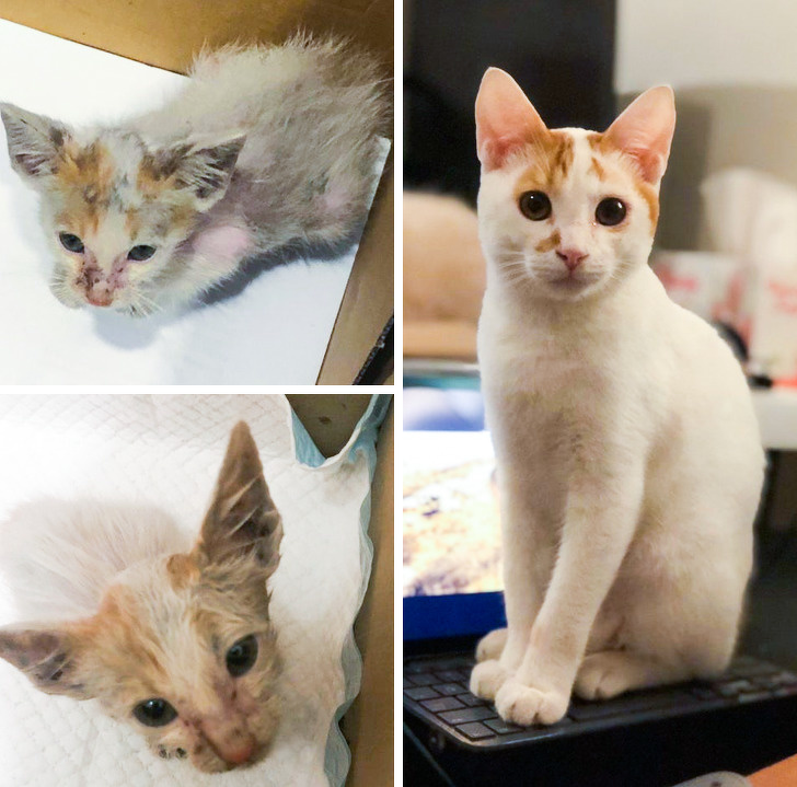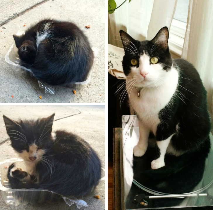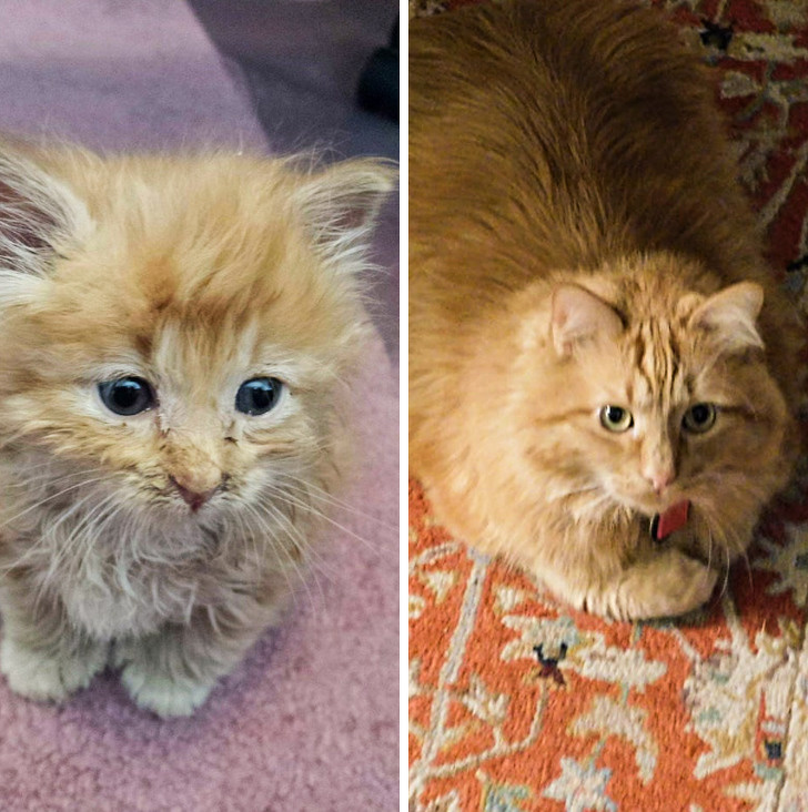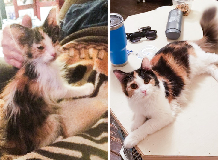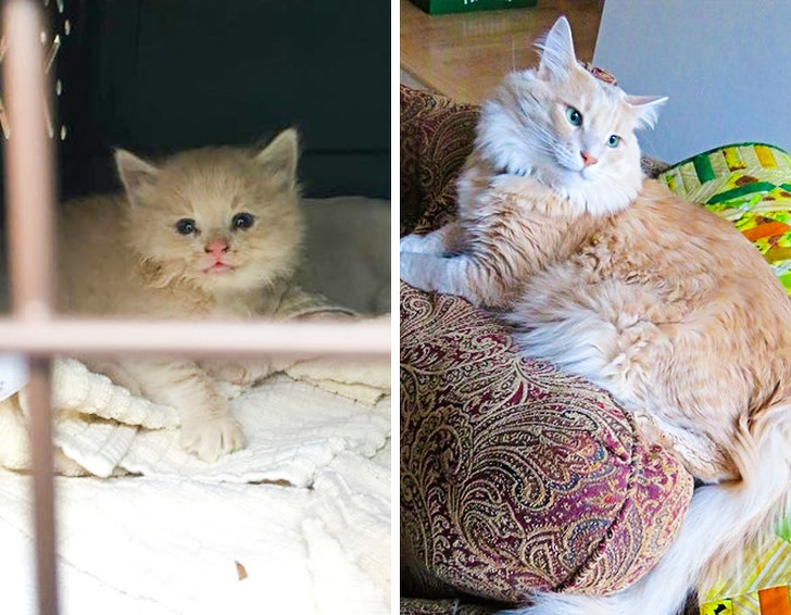 18. «Цей кошеня був знайдений в коробці, нічим зверху не укритою. Праворуч — Пенні місяці потому. Наша пухлощока ласкава дівчинка»