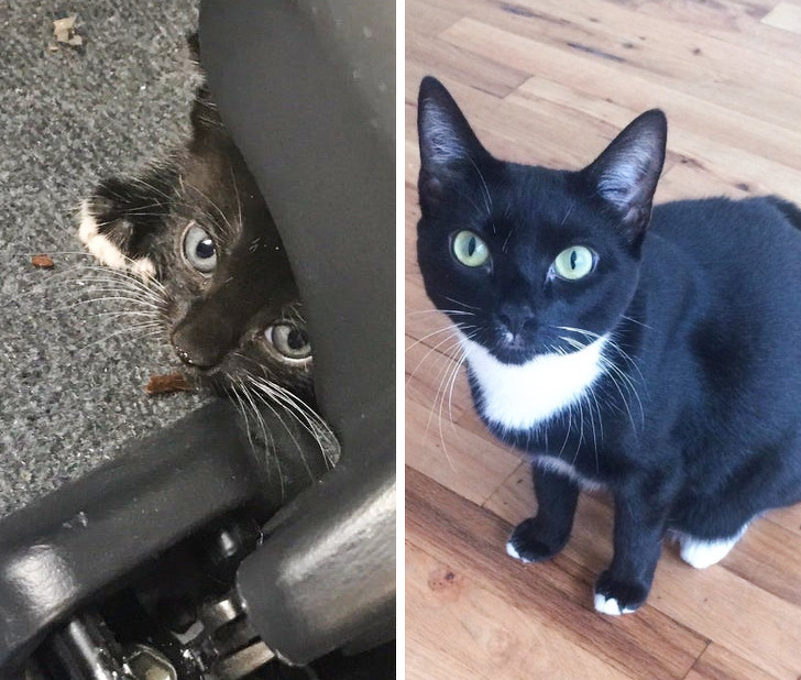 2. «2 роки тому я знайшла цього кошеня на узбіччі шосе. Він був так наляканий, що сховався під заднім сидінням. Друга фотографія була зроблена пару місяців тому моїм другом, який поселив його у себе»