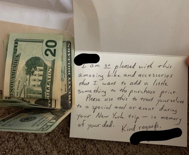 9. «Я продав e-bike покійного батька хорошій людині з великою знижкою. Сьогодні він повернувся на велосипеді і залишив це для поїздки моєї дочки в Нью-Йорк»
