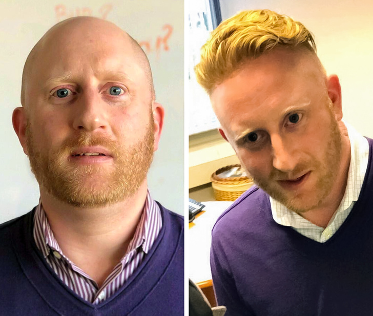 Невеликий парик прикріплюється на поголений ділянку голови за допомогою спеціального клею або особливого скотча. Клейова система тримається 3-4 тижні, перуку на скотчі необхідно оновлювати кожні 7 днів. Філіп зізнається, що найбільш хвилюючий момент — коли клієнт вперше бачить результат. Але вистачить слів, подивіться на це самі!