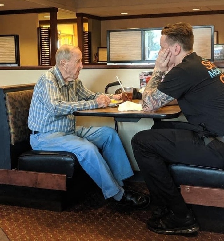 2. Літній джентльмен прийшов в ресторан на самоті, і коли він почав розповідати офіціантові історії зі свого життя, той взяв перерву, щоб вислухати його