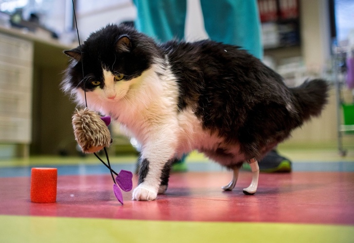 8. Бездомний кіт Пух потрапив під машину і позбувся задніх лап. Болгарський хірург імплантував йому титанові протези і повернув здатність ходити