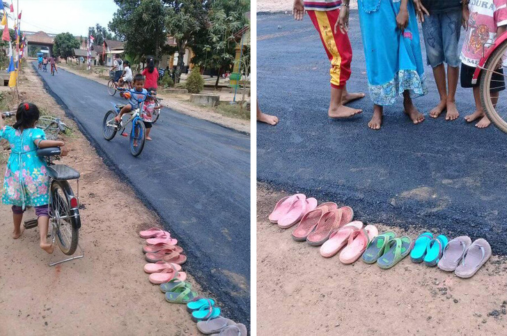1. Діти з індонезійської села зняли взуття, щоб не забруднити асфальт, який вони бачать вперше в житті