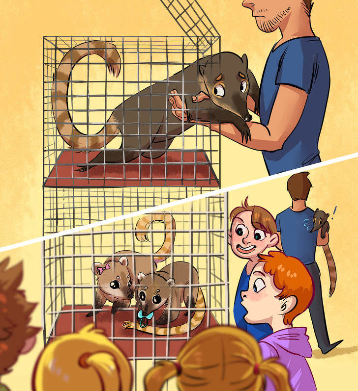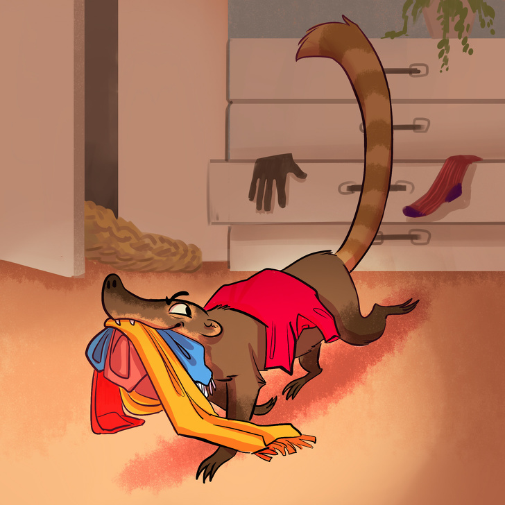 А один раз під час чергової прибирання екзотичний улюбленець забрав сорочку доньки Юлії. Коли дівчинка спробувала відняти її, розгніваний таким нешанобливим ставленням носуха загнала її на пральну машинку. Для науки.