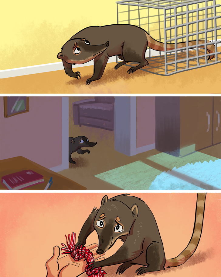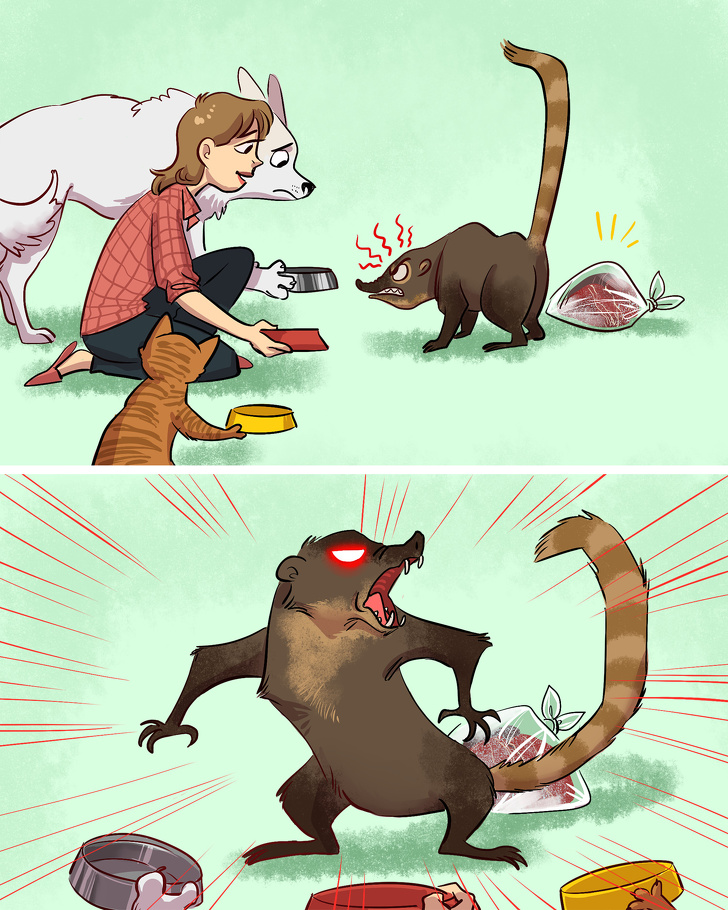 З часом носуха відчула себе відповідальною і за інших мешканців будинку, тому стала знімати пробу з м'яса, яким тих годували. Причому так люто взялася за виконання цих обов'язків», що відібрати здобич у неї було просто неможливо: чарівний вихованець моментально трансформувався в розлюченого «гіббона».