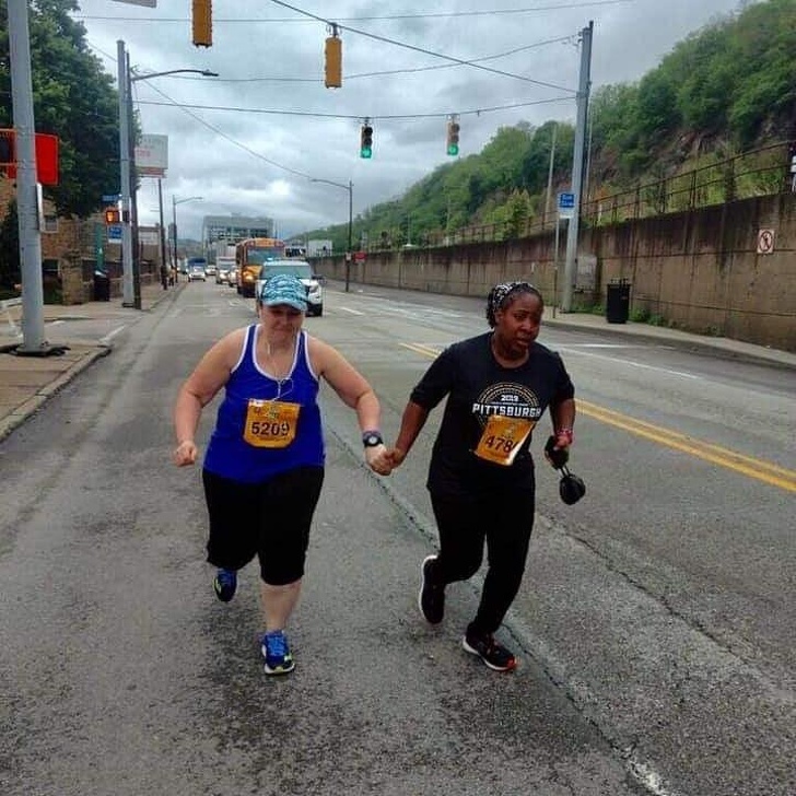 Два останніх учасника Піттсбурзького марафону підтримують один одного, щоб дістатися до фінішу