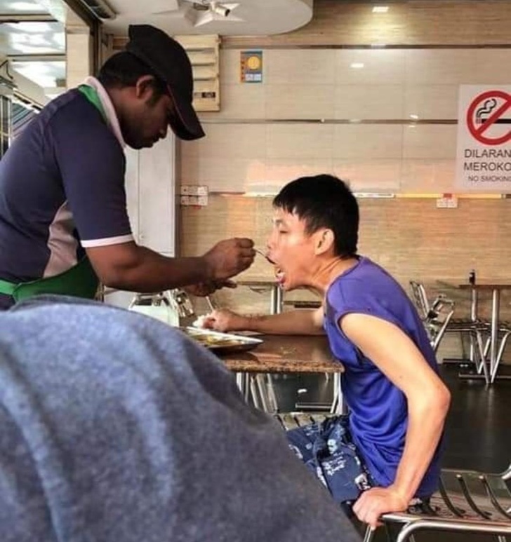 Офіціант в ресторані допомагає відвідувачеві з особливими потребами прийняти їжу