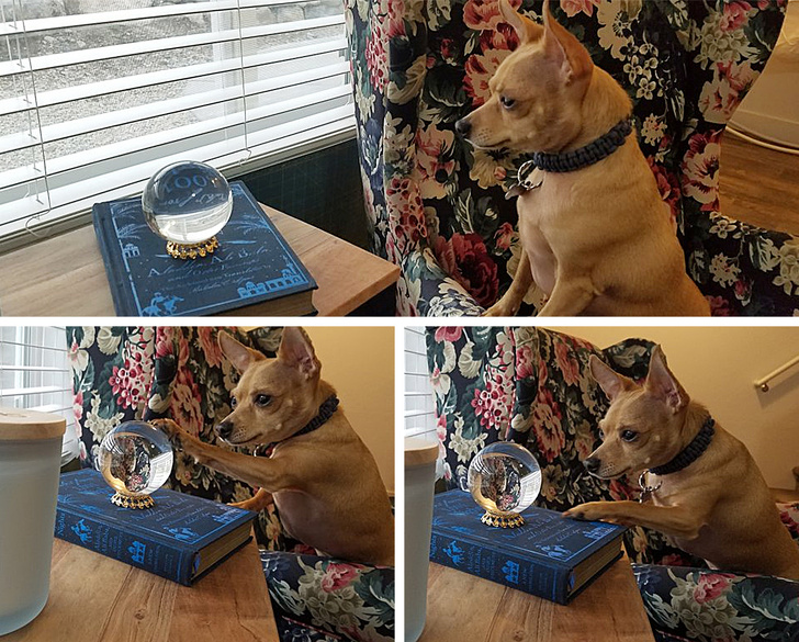 «Моя собака спостерігає за людьми на вулиці, які відображаються в кришталевій кулі. Але виглядає так, ніби вона бачить майбутнє»