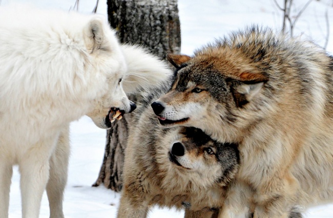 Самка сховалася під самця. Погляд у неї спокійний, вірить в свого. І не тільки тому, що він сильний. У цих звірів самець не може самку атакувати, вона це знає. І прикриває собою горло своєму самцеві. І робить вигляд, що просто ховається.