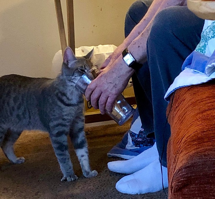 «Батько врятував кішку, яку дуже рано забрали від матері. Вона п'є воду тільки з його рук. Він напуває її таким чином кілька разів на день»
