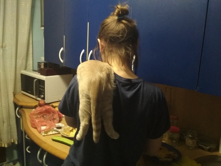«Кіт любить залізти і кататися на плечах. Ось так готуємо вечерю. Висить і мурчит»