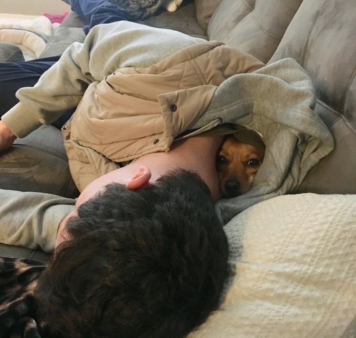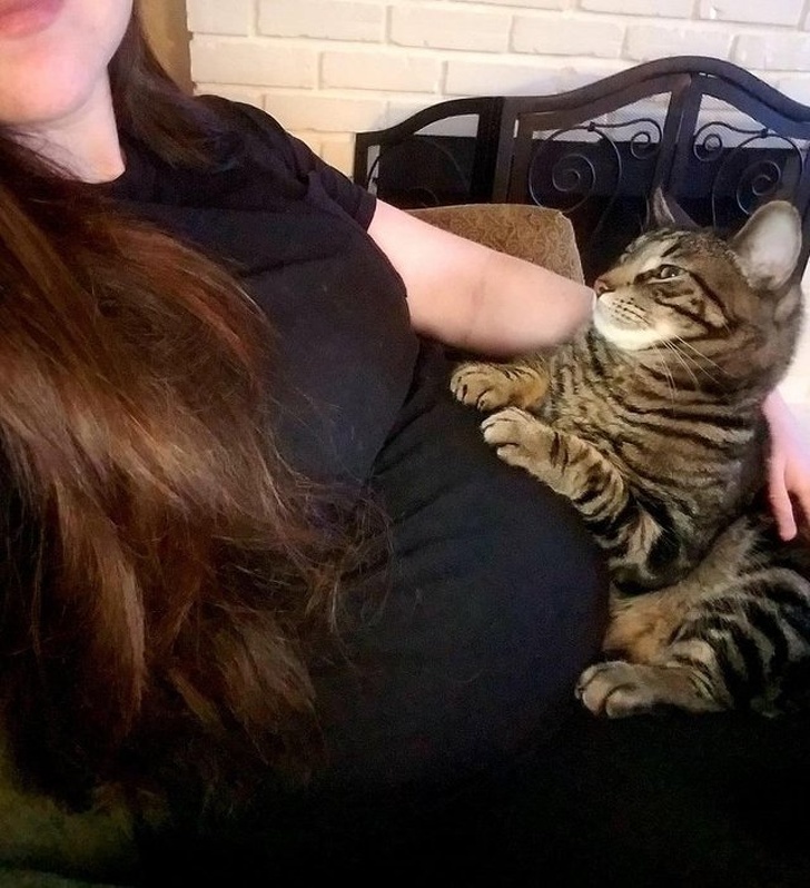 «До мене прийшла найкраща подруга, вона вагітна, а моя кішечка дуже зацікавлена в її „горбку“. Їй подобається сидіти, поклавши на нього лапи»