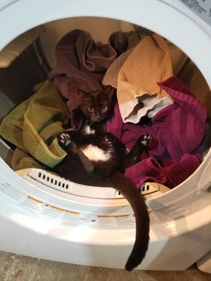 «Я збиралася скласти рушники, коли ця маленька дівчинка вирішила стрибнути в сушарку. Я повернула барабан, намагаючись змусити її піти, і ось результат»