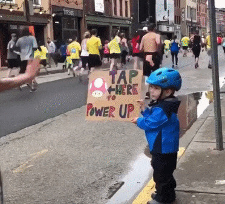 7. Хлопчик тримає табличку з грибочком з «Маріо» та текстом «Торкніться тут, щоб підвищити силу»