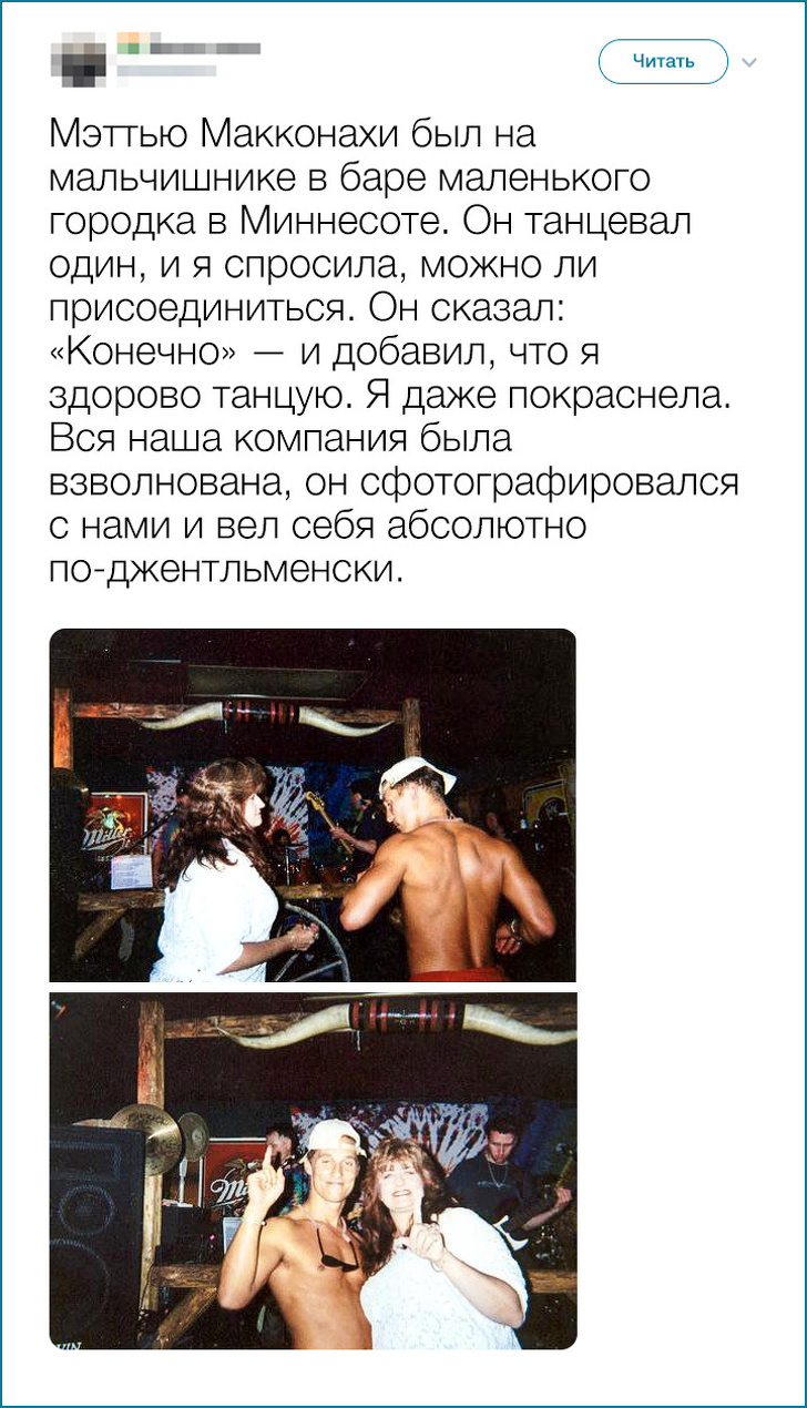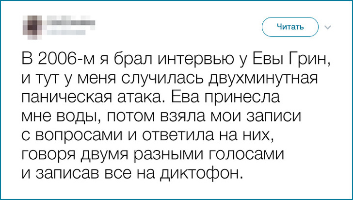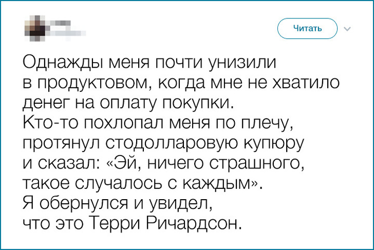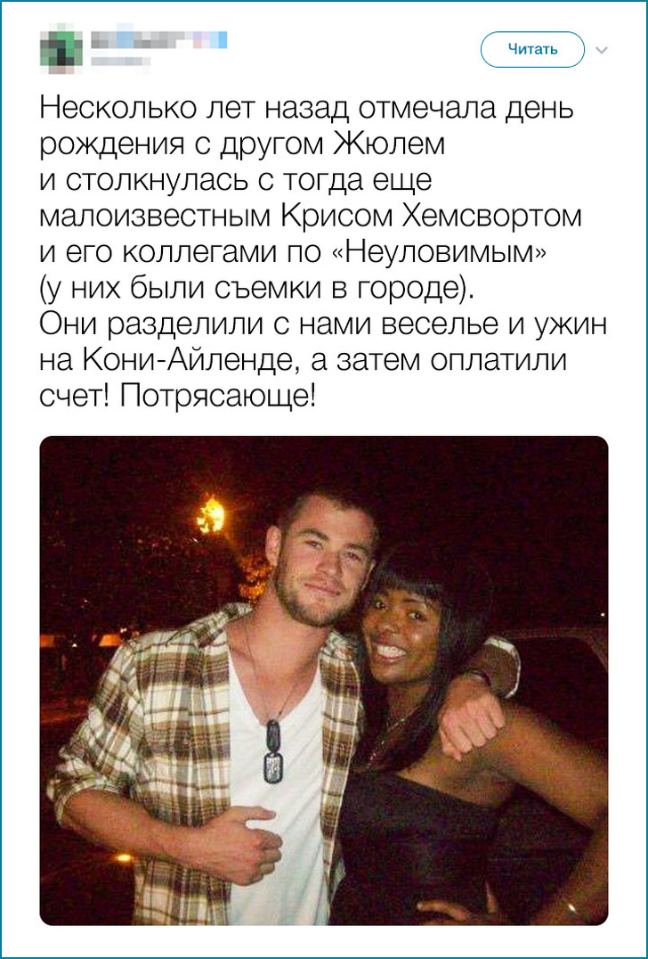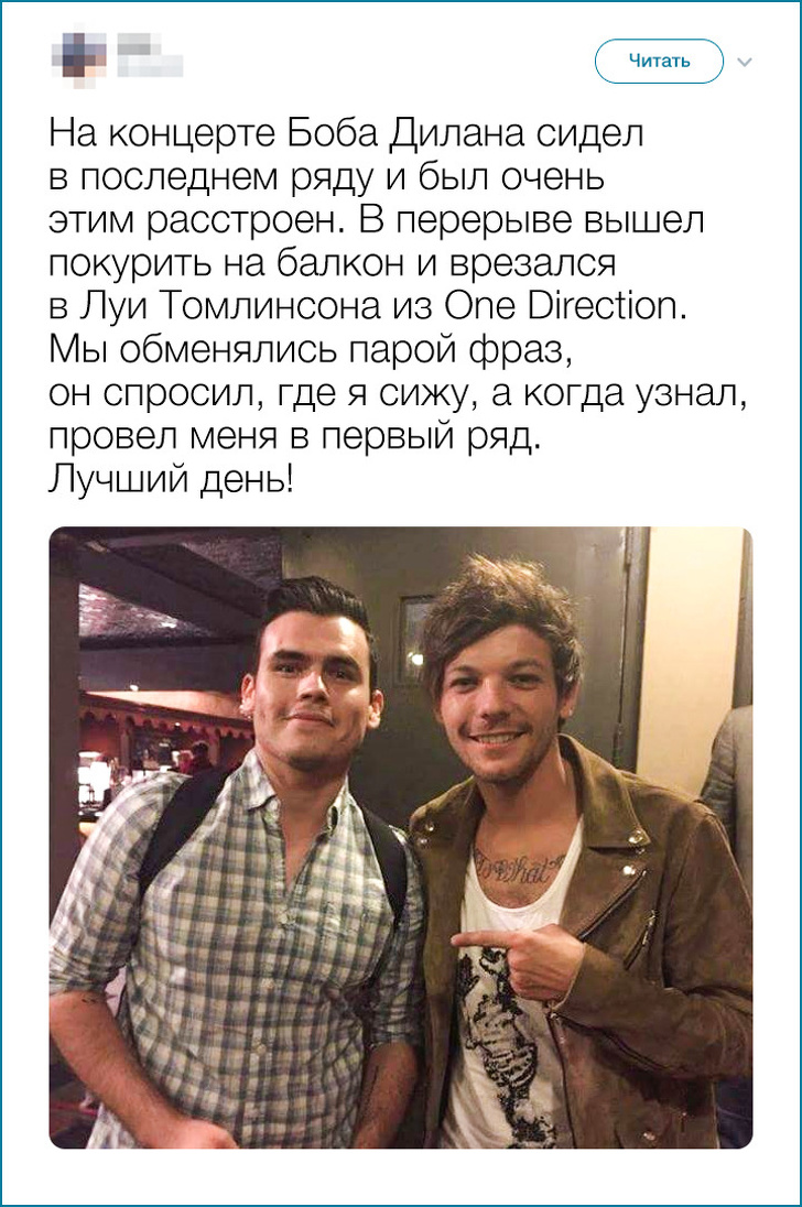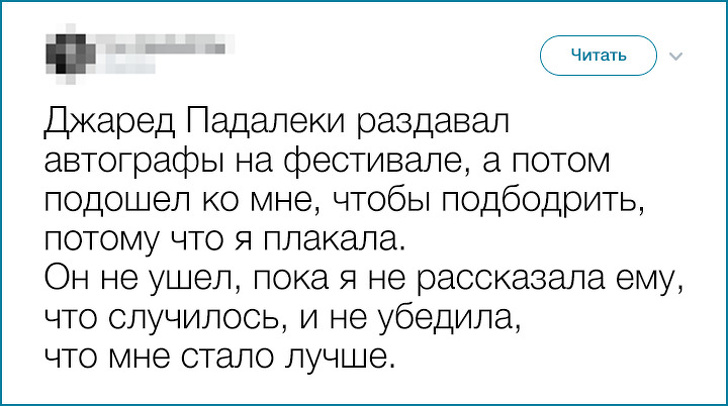 Прийнято думати, що знаменитості далекі від своїх шанувальників і зустрічають їх тільки на роздачі автографів, але багато людей можуть спростувати цей стереотип. Вони розповіли про свої зустрічі з зірками у відповідь на прохання користувача твіттера з ніком BAKKOOONN. Неможливо не посміхнутися, читаючи ці повні тепла і захоплення історії.