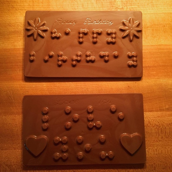 «Моя дочка сліпа, тому на її 9-річчя ми замовили особливий шоколад. Тут написано: „З днем народження“ та „Ми любимо тебе“»