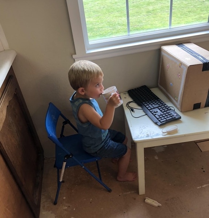 «Мій трилітка зображує свого тата (він працює з дому, в IT-сфері): клавіатура, мишка, екран комп'ютера. І кава, звичайно»