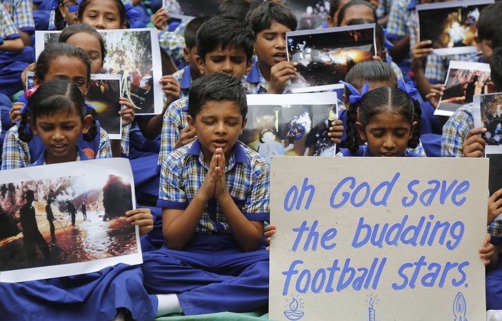 Індійські школярі тримають у руках фотографії, зняті в тайській печері, і плакат з написом «О Боже, спаси висхідних футбольних зірок».