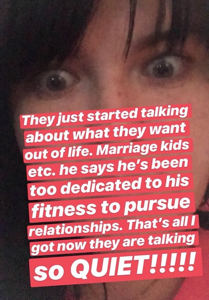 «Вони почали говорити про те, чого хочуть від життя. Шлюб, діти і все таке. Він каже, що витрачав занадто багато часу на фітнес і не замислювався про стосунки. Це все, що я розчула, тому що вони розмовляють дуже тихо».