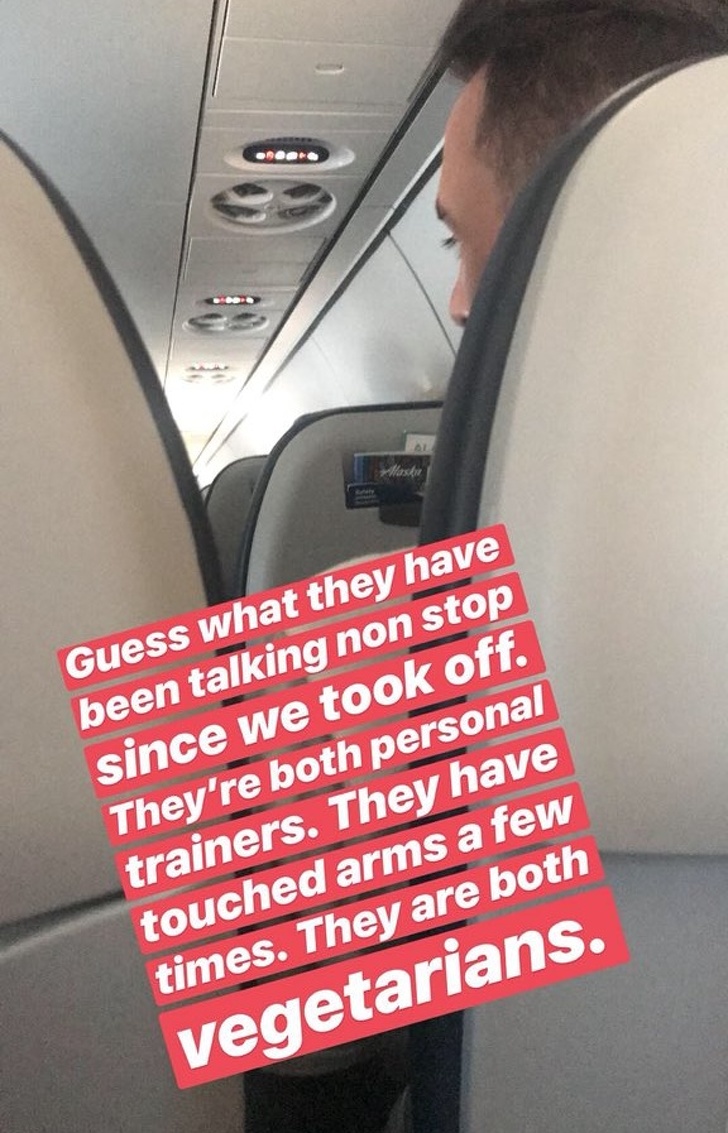 «Вгадайте, про що вони без угаву розмовляють з тих пір, як ми злетіли. Обидва персональні тренери. Вони стосувалися один одного руками кілька разів. Вони обидва вегетаріанці».