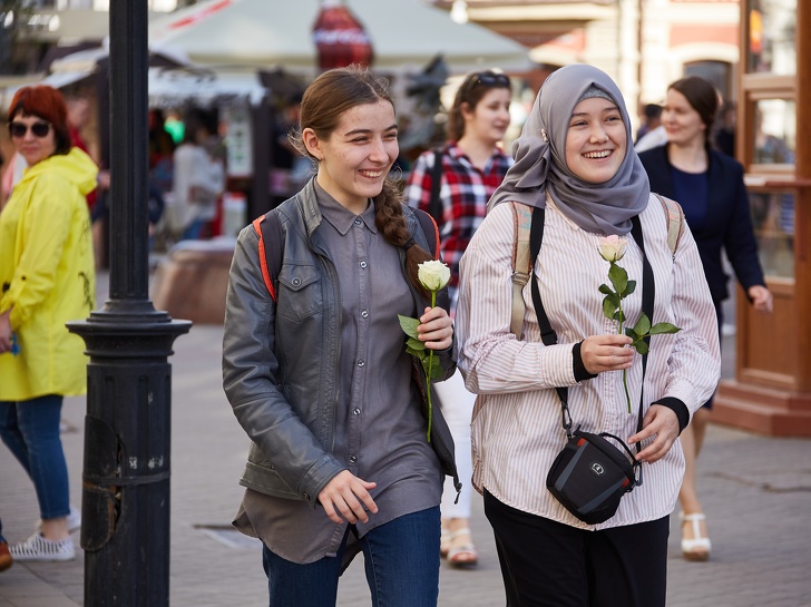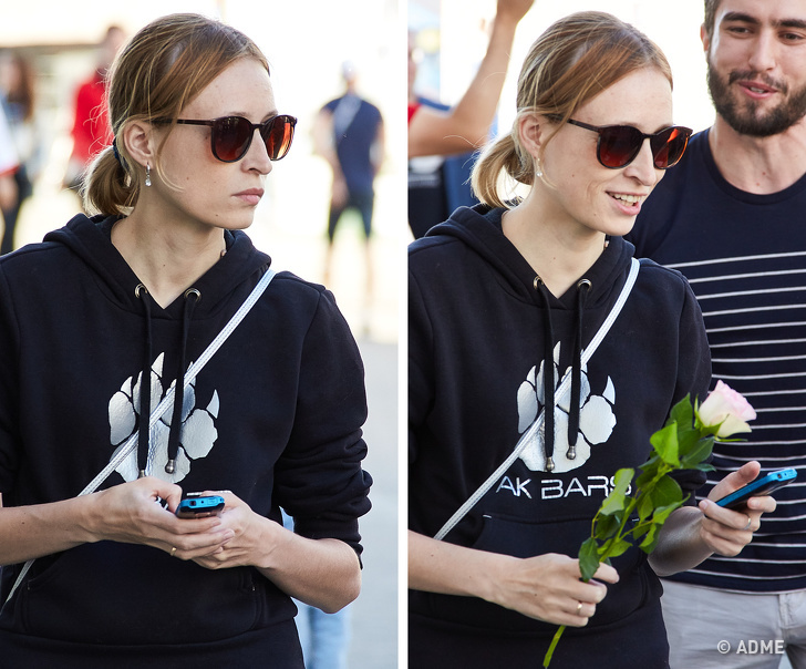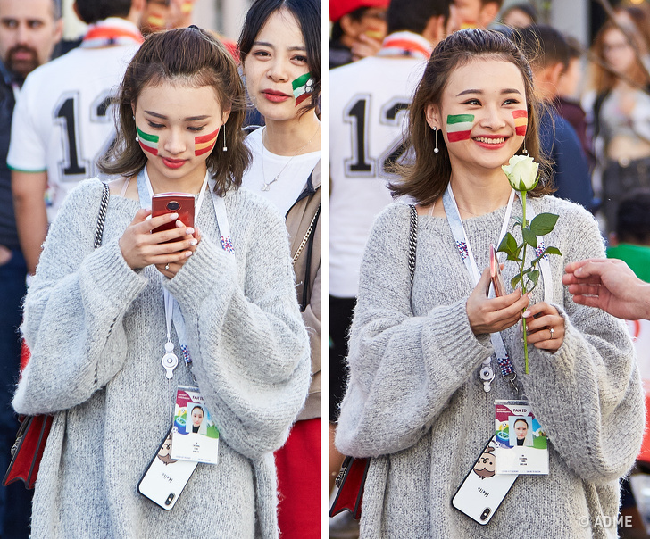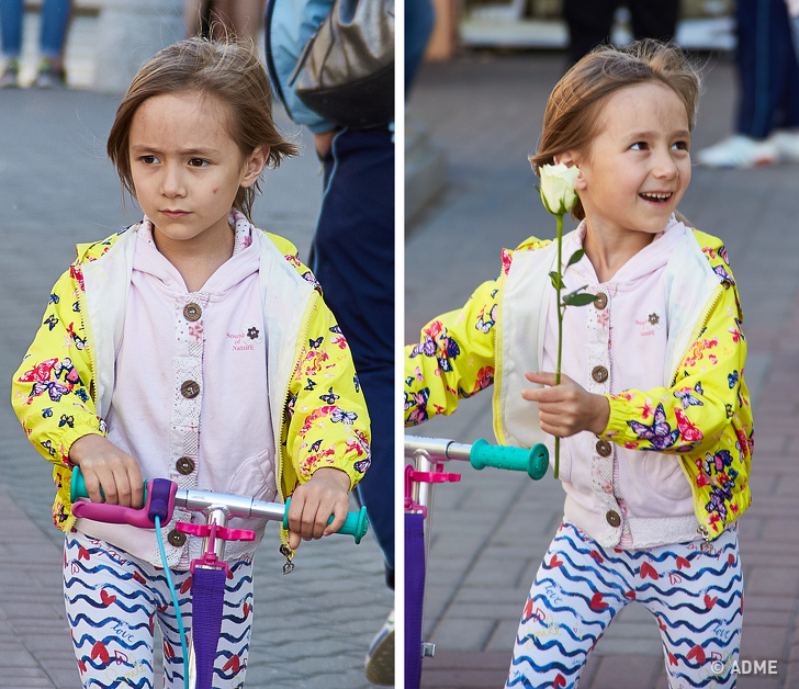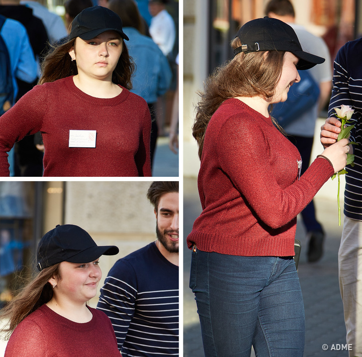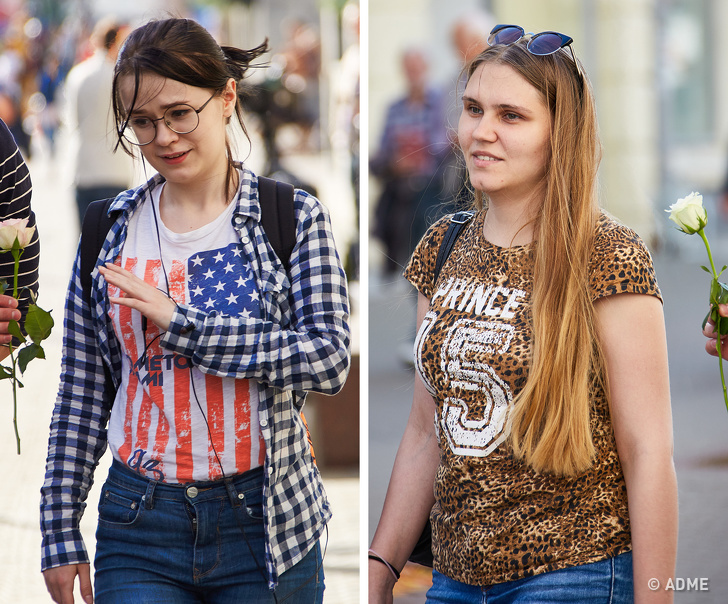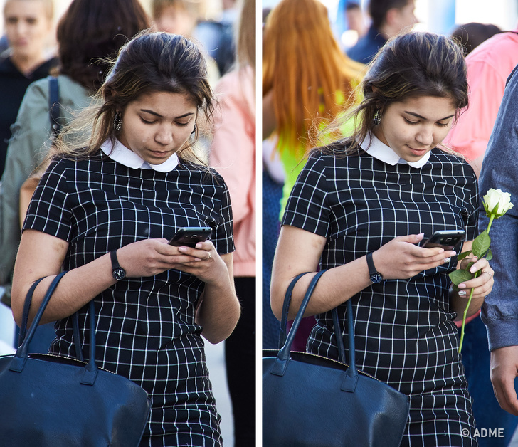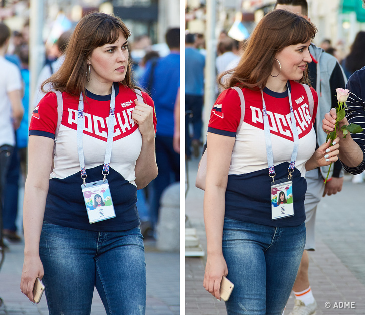 Деякі дівчата чемно прийняли квітка, але поспішили далі по справах, знову поринувши в свій смартфон. І все-таки нехай легкі, але все-таки посмішки встигли з'явитися і на їхніх обличчях.