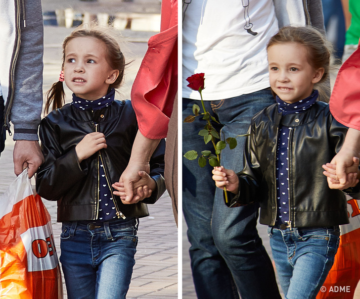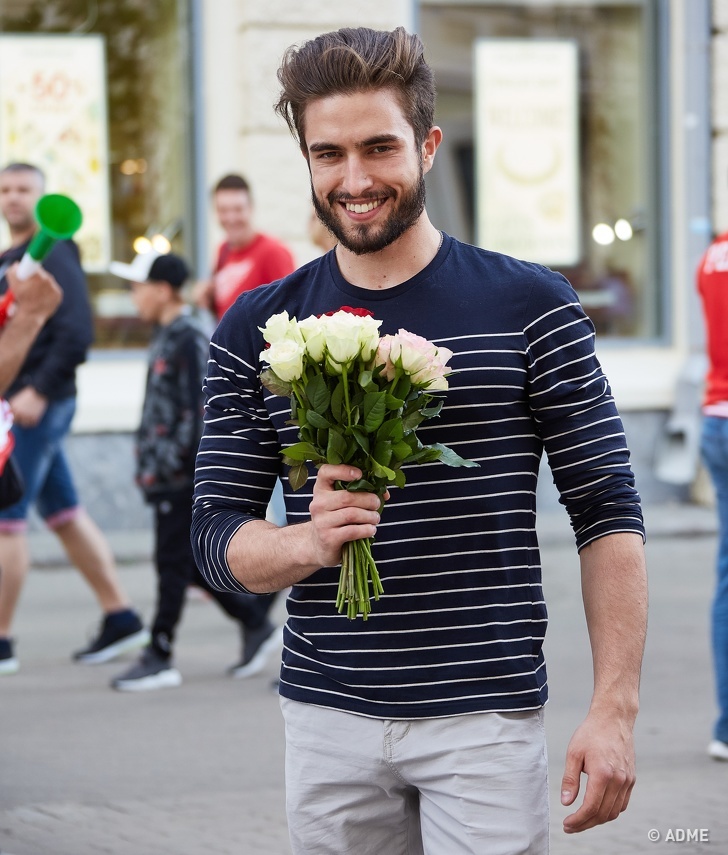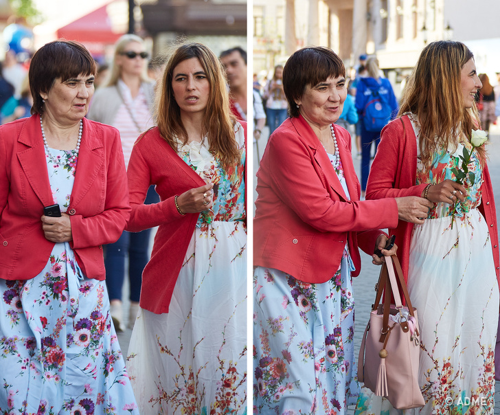 Знайомтеся, це Ратмір. Він буде підходити до дамам з побажаннями гарного настрою і спробує кожної з них подарувати по квітці. Вулиця дуже шумна і тут завжди багато людей, тому наш фотограф без праці сховався в натовпі трохи віддалік.