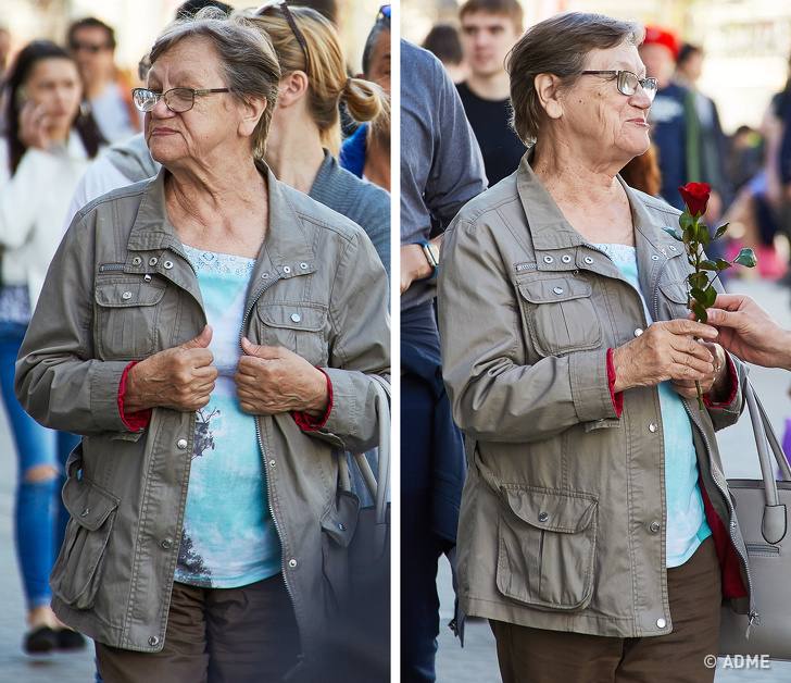 Чесно кажучи, у нас були деякі побоювання перед цим експериментом: як вони поставляться до такого увазі, що вони будуть говорити? І ми ніяк не очікували, що не тільки подаруємо, але і самі отримаємо величезний заряд позитивних емоцій: було неймовірно здорово бачити, як на обличчях абсолютно незнайомих людей з'являються посмішки. Чому-то й нам самим у цей момент ставало радісно і світло на душі.