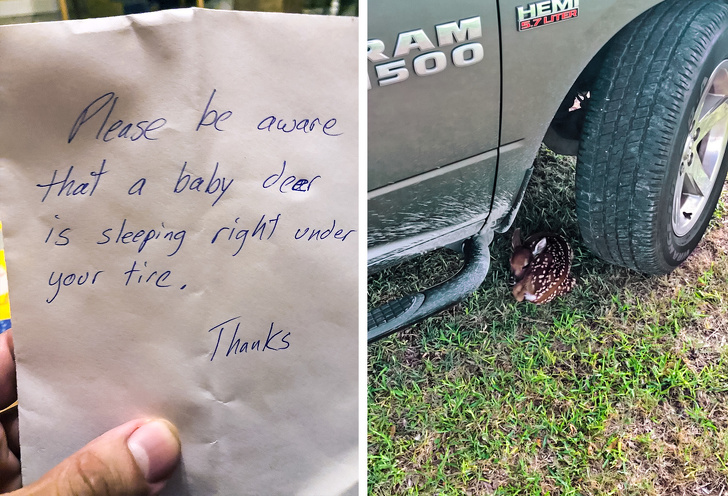 «Будь ласка, будьте обережні. Оленятко спить прямо під вашим колесом. Спасибі».